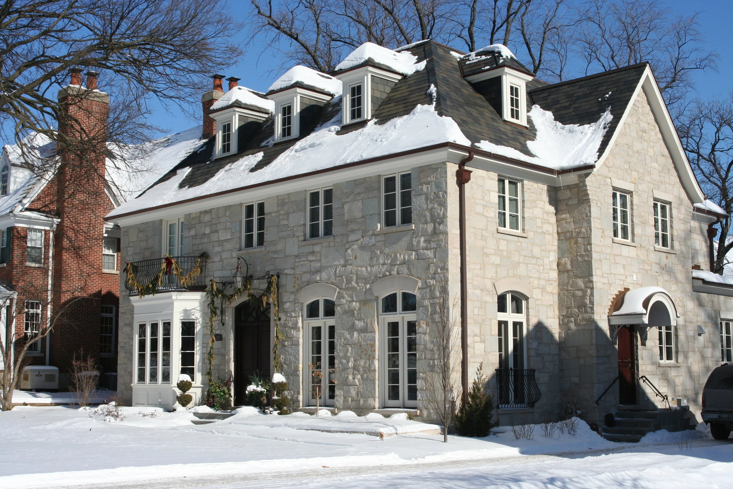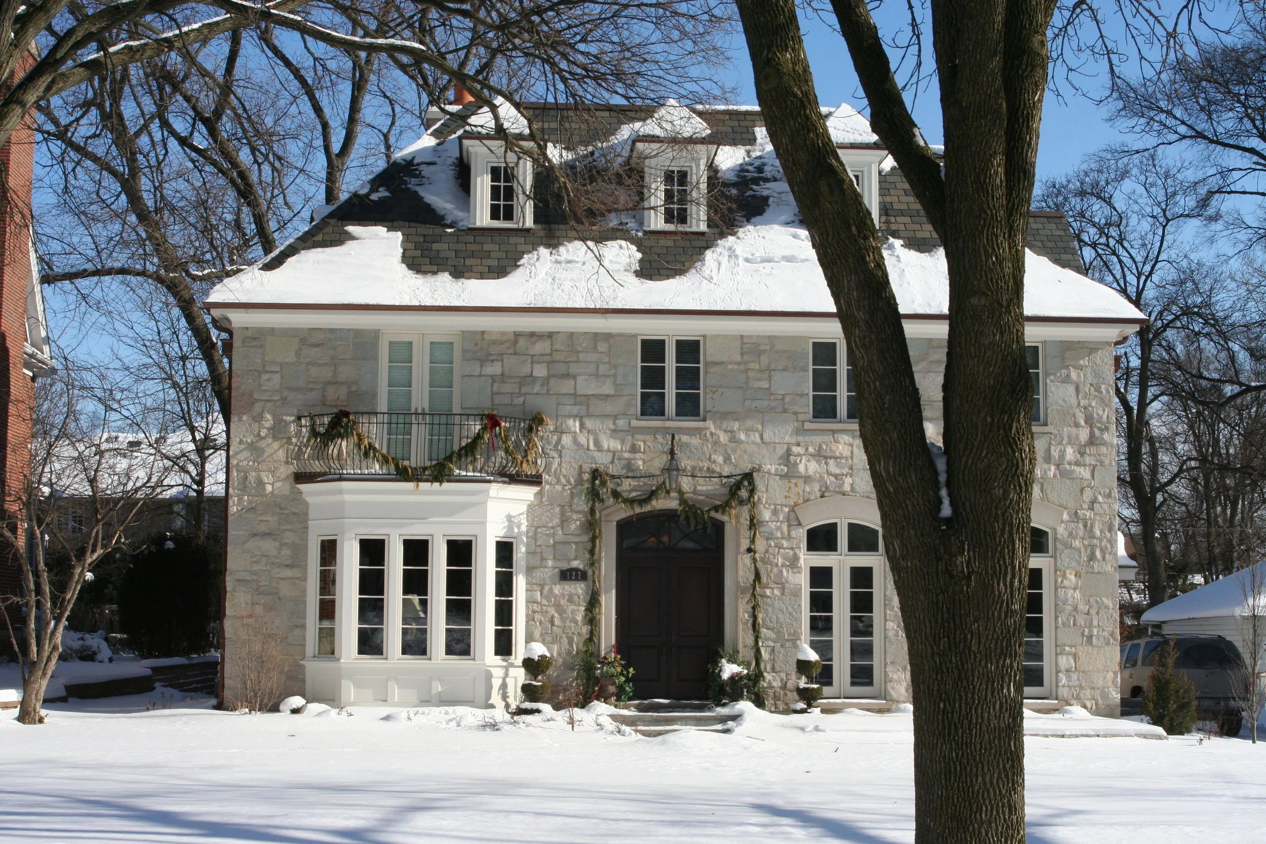 The rustic stone façade of this French Eclectic residence is grounded by its straightforward proportions, detailing, and massing. On this infill lot in Hinsdale, the form follows function with secondary side entry and detached garage. The interior diverges from the exterior’s simplicity with beautiful detailing of pilasters, wainscoting, and built-up crown moldings in the formal library, dining room, and foyer.