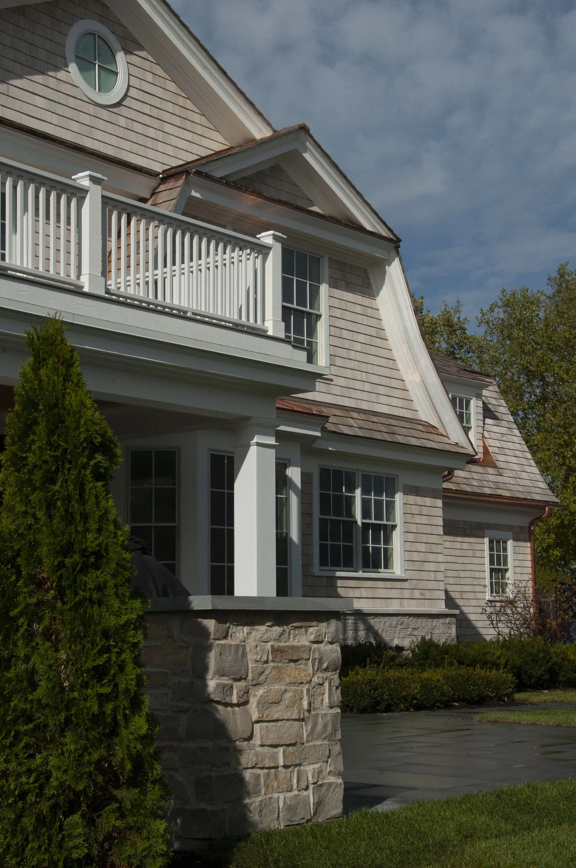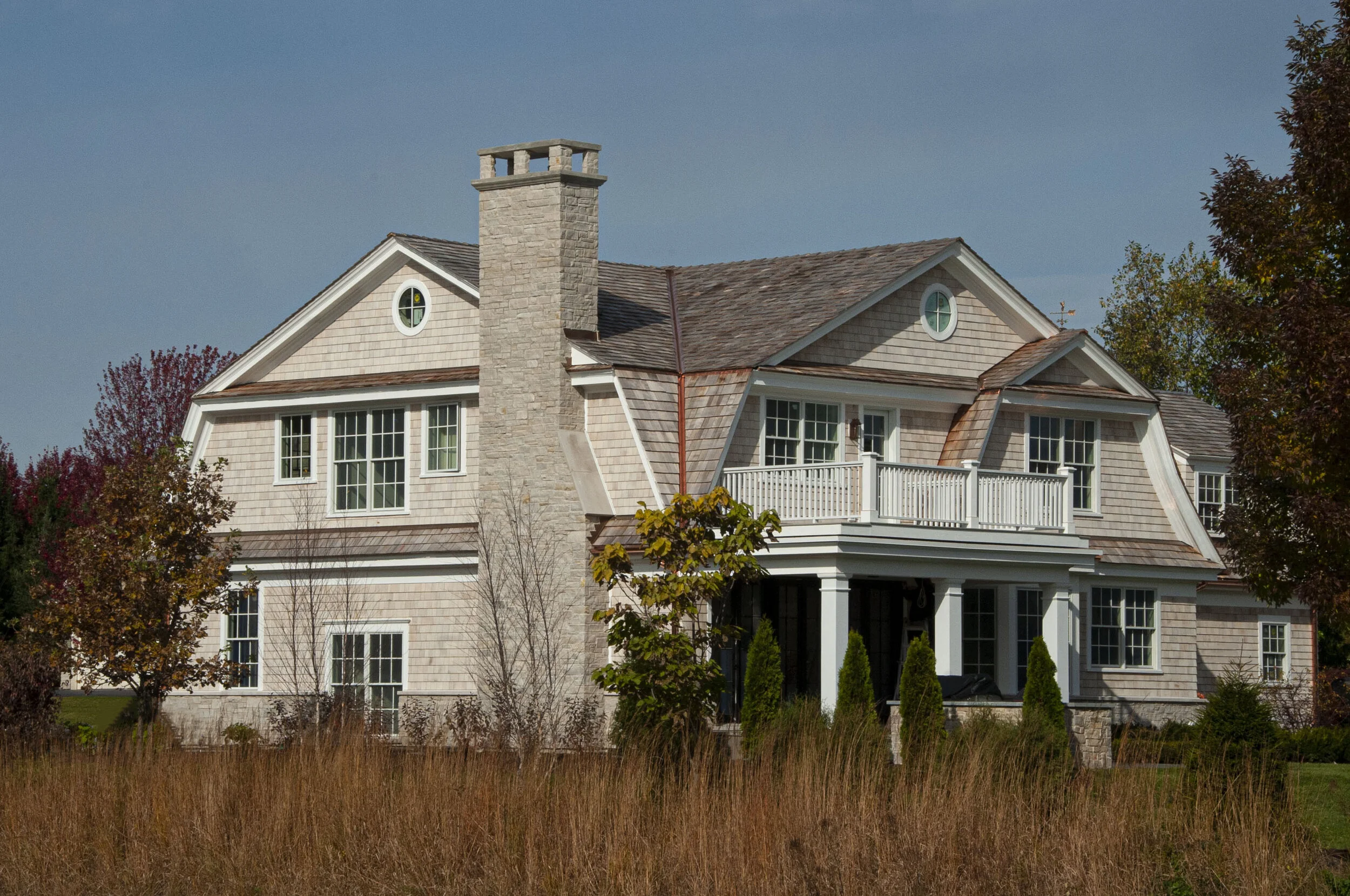 This classic shingle style home with sweeping gambrel roof forms is framed by the natural settings of Lake Forest.