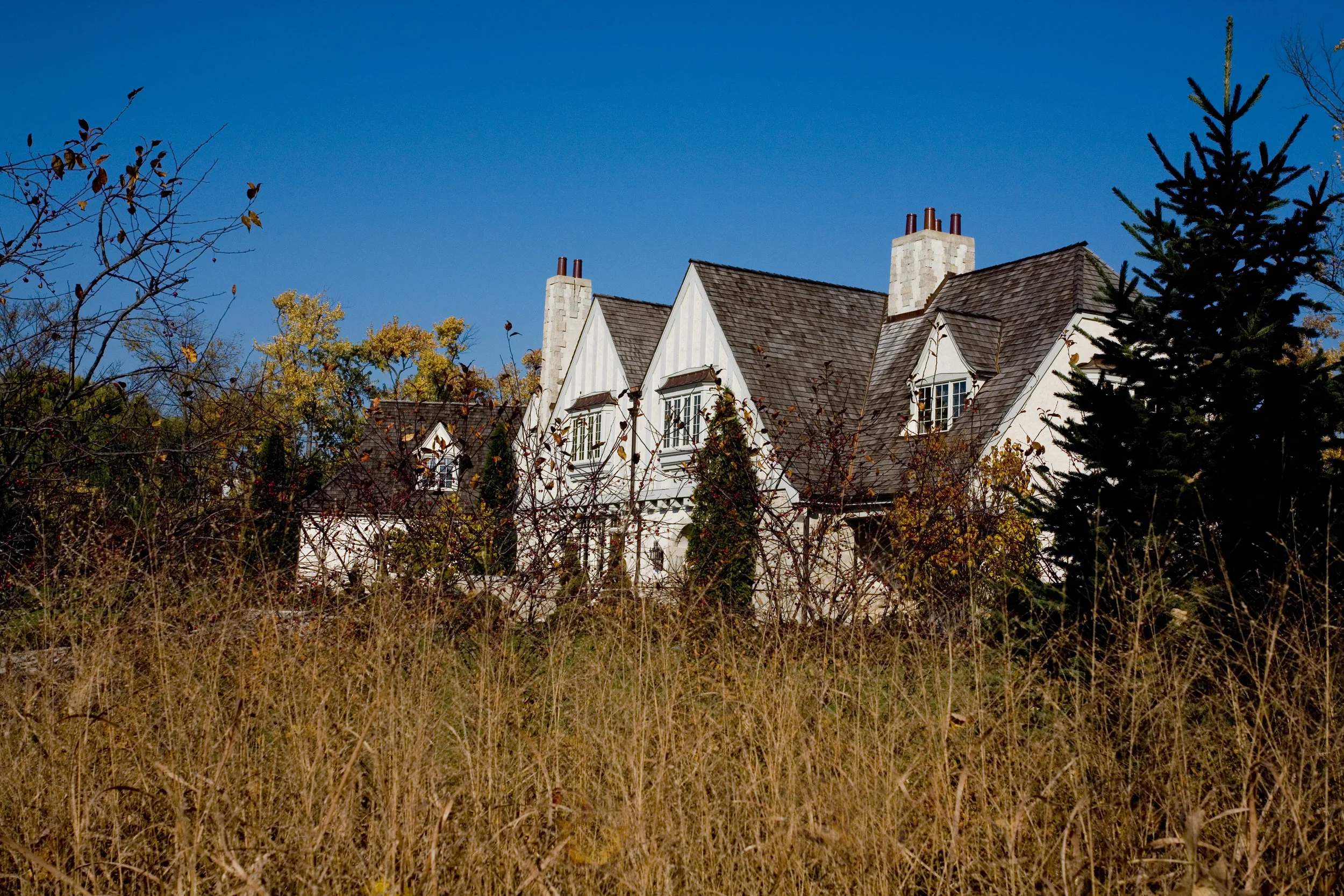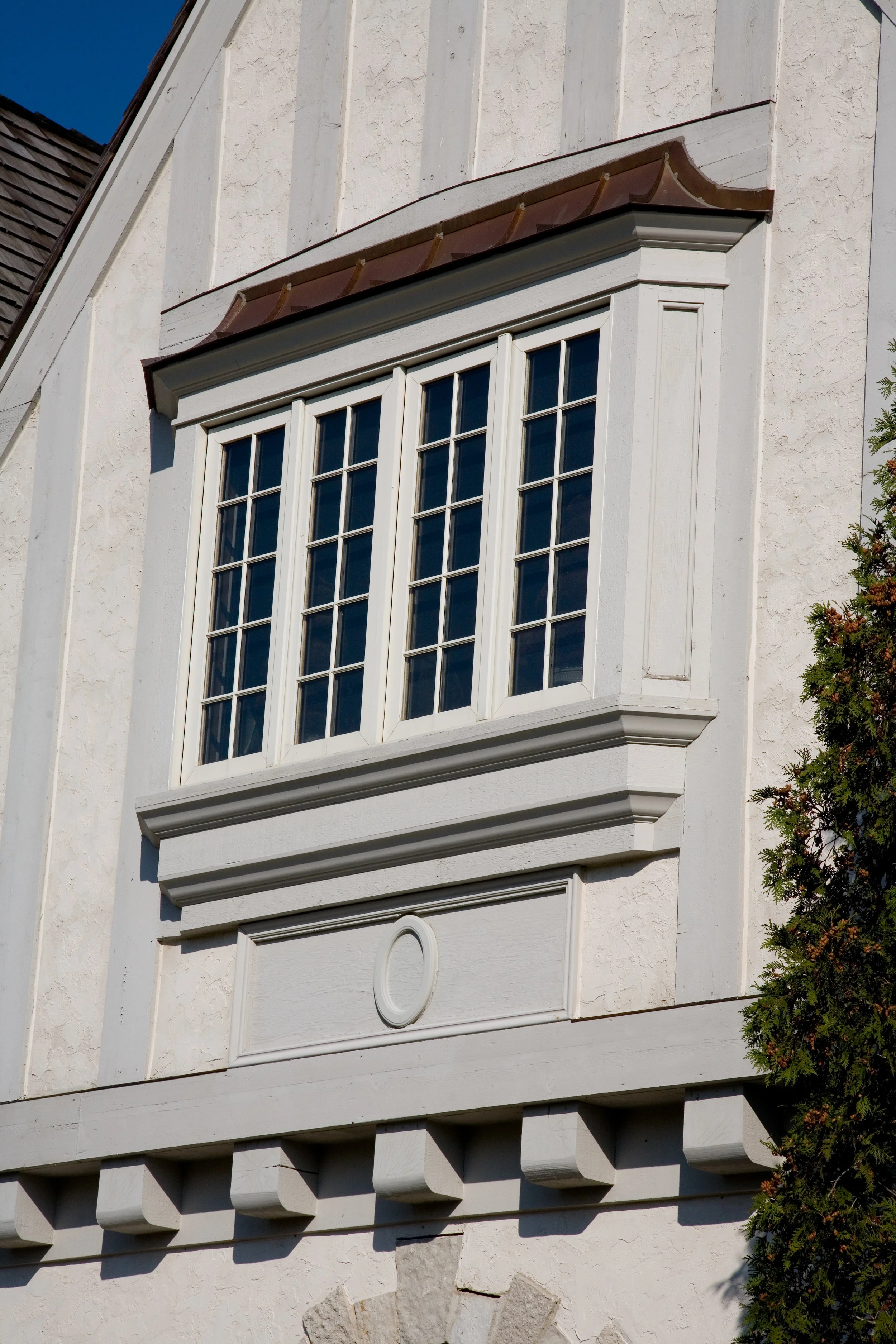 MEB Architects Ltd - two-story bay windows with vertical fretwork. Our firm designed this new English Country home with subtle Tudor influence featuring twin gables and two-story bay windows with vertical fretwork. The sweeping conjoined gables provide drama to the massing of this home while the detailing of the bays provides a uni design element. The classic residence reflects authentic European style and proportion with a floor layout conducive to modern comfortable living.