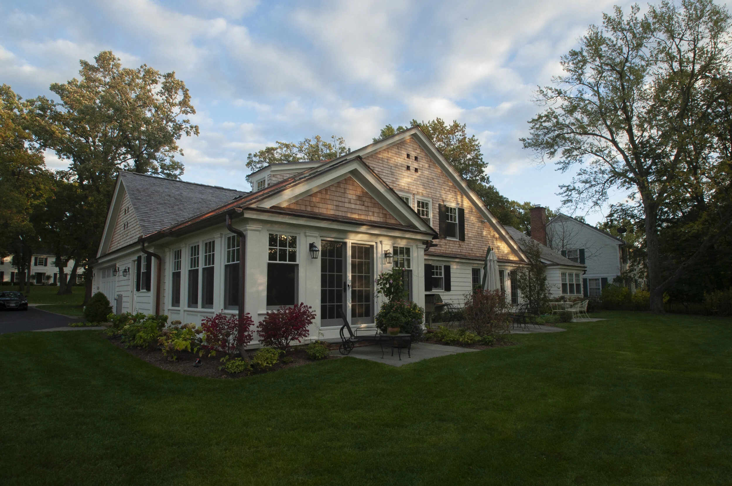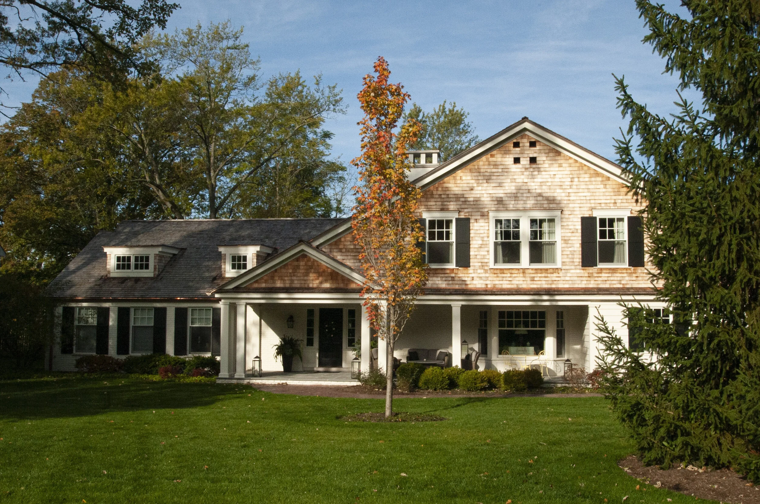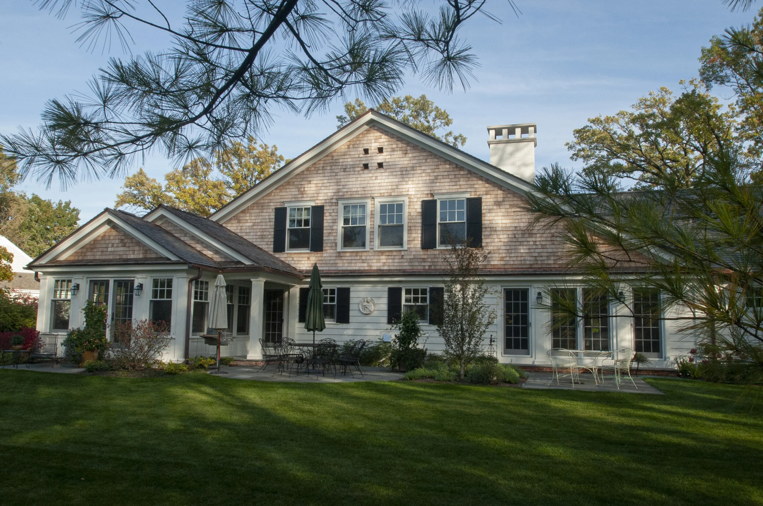 This 1960s ranch is transformed into a comfortable shingle-style home with a broad and sweeping main gable and an integrated porch.